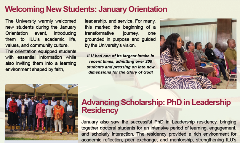 Welcome to the January 2026 edition of the ILU Newsletter. As we step into a new year, January has been a month of prayer, reflection, and renewed commitment across the University. From our Opening Prayer Day and the resumption of chapel services, to welcoming new students and strengthening our teams, the month set a strong spiritual and institutional foundation for the year ahead.